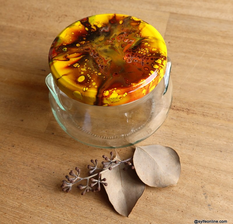 My 1st attempt to do fluidart on the metal lids of the glass jars was to protect the inside, sand the top of the lid and apply my paint directly. After at least 10 days of drying, I took the option of resinating them. The final result is very pretty but as the resin inevitably makes drops, I had to sand the underside of the cover and then varnish the sanded part.