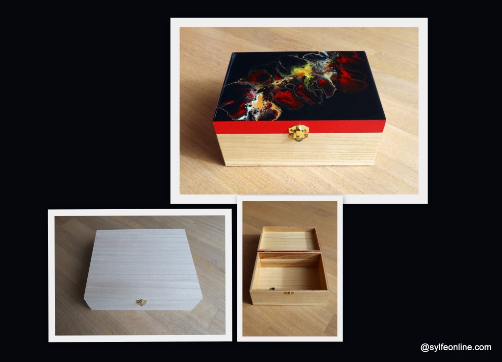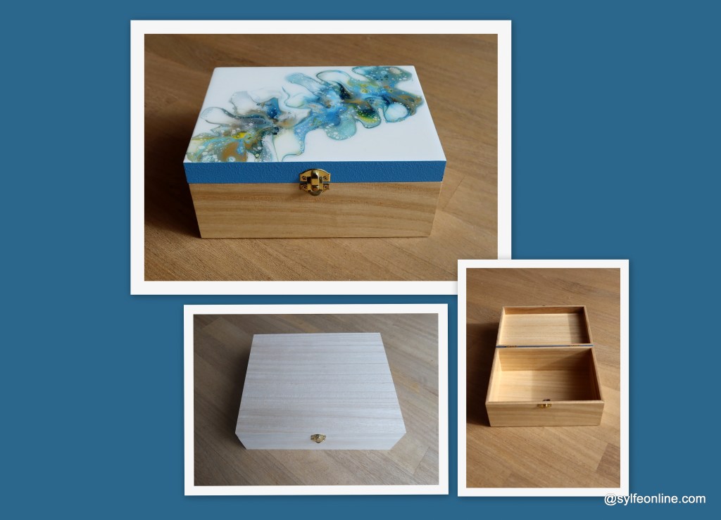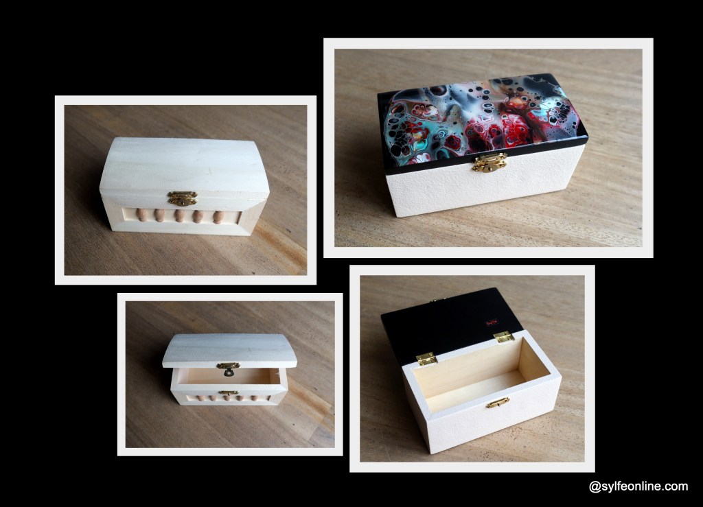 To answer some requests, you will find here some photos of the objects used for my fluidart before and after « transformation ». It is true that seeing the finished product does not always make it possible to carry out the work provided upstream. For some objects, the preparation phase and the finishing touches can take a long time. This is the case with wooden boxes, bookmarks and the lids of glass jars.