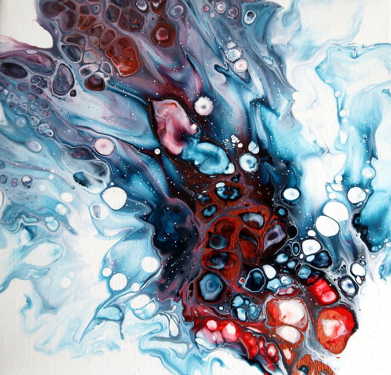 With this method, I spread white paint uniformly on my canvas with a hair dryer. Then, in the lower right corner I pour a little bit of paint of different colors, each color on top of the other, forming a circle. I surround this small colored disk with white paint. With the hair dryer I start by pushing the white paint on my colored disk in the direction of the canvas’ lower right angle. Then I do the opposite, blowing on the colors to spread them on the rest of the canvas. Finitions are done by blowing directly with the mouth or using a straw. This method is very well explained in the YouTube videos of a Dutch artist, whose work I really like!
